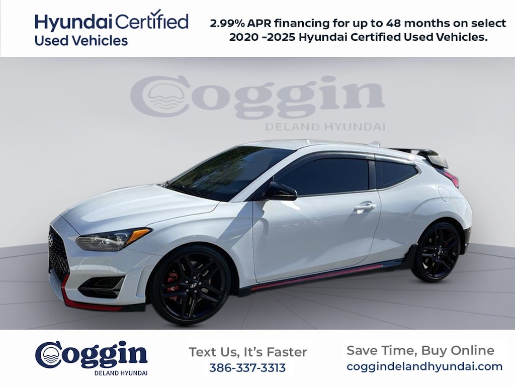 HYUNDAI CERTIFIED!! 10 YEAR 100K POWERTRAIN WARRANTY!! 22/29 City/Highway MPG **ONE OWNER**, **LOW MILES**, **LOCAL TRADE**, **BLIND SIDE MONITOR**, **HEATED SEATS**, **LANE DEPARTURE WARNING**, **BLUETOOTH**, **ALLOY WHEELS**, **APPLE CARPLAY**, **ANDROID AUTO**, **BACKUP CAMERA**, **NAVIGATION**, **BLINDSPOT/CROSS TRAFFIC**, **FL VEHICLE**, **CARFAX ACCIDENT FREE**, **SAVE TIME BUY ONLINE, **ALL SERVICE RECEIPTS/REPAIR ORDER AVAILABLE UPON REQUEST, **FACTORY TRAINED TECHNICIANS, **PERSONALIZED VIDEOS, Veloster N **CERTIFIED**1-OWNER**, 3D Hatchback, 2.0L Turbocharged, 6-Speed Manual, FWD, Chalk White, Black Cloth, 13.6 Front Rotors & 12.4 Rear Rotors, 4-Wheel Disc Brakes, ABS brakes, Air Conditioning, Alloy wheels, Automatic temperature control, Brake assist, Electronic Stability Control, Exterior Parking Camera Rear, Four wheel independent suspension, Front Bucket Seats, Front Center Armrest, N Corner Carving Differential, Option Group 02, Performance Package, Power steering, Power windows, Rear window defroster, Rear window wiper, Remote keyless entry, Split folding rear seat, Steering wheel mounted audio controls, Variable Exhaust Valve System, Variably intermittent wipers, Wheel Locks, Wheels: 19 x 8.0J Alloy. CARFAX One-Owner.