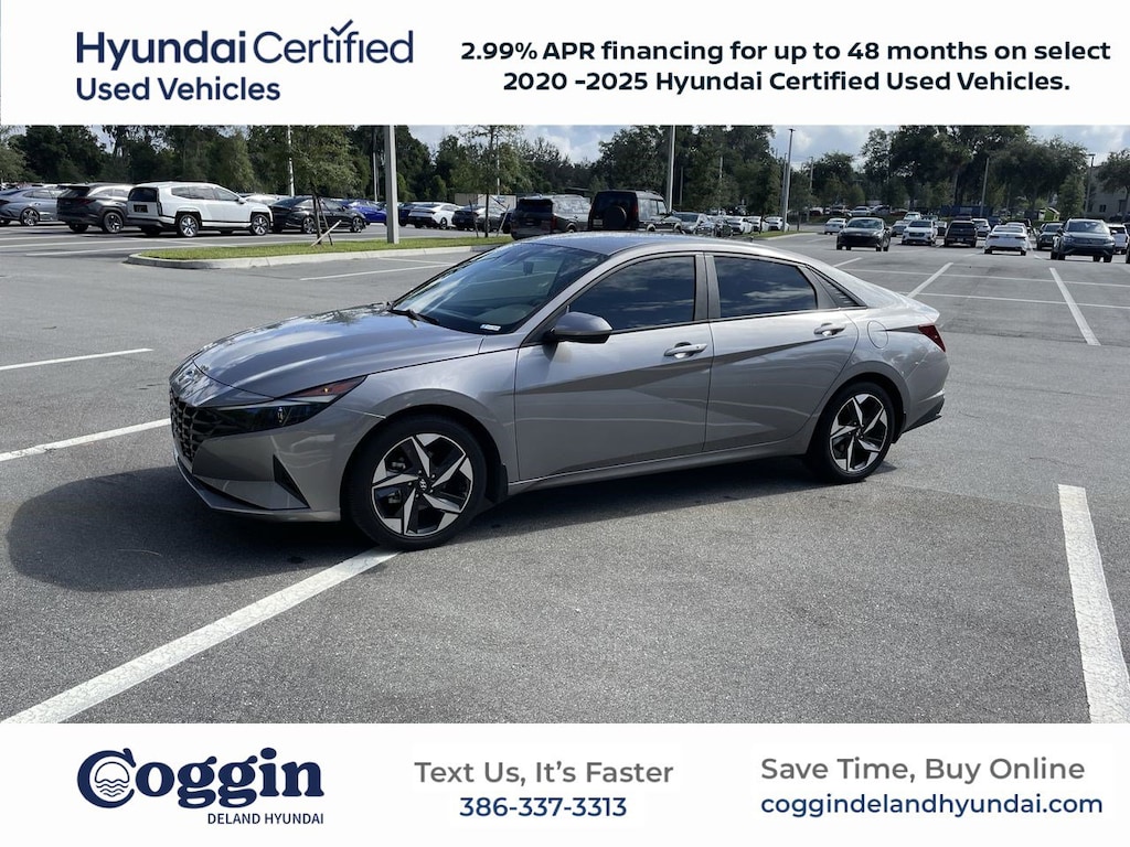 HYUNDAI CERTIFIED!! 10 YEAR 100K POWERTRAIN WARRANTY!! 30/40 City/Highway MPG **LOW MILES**, **LOCAL TRADE**, **BLUETOOTH**, **ALLOY WHEELS**, **APPLE CARPLAY**, **ANDROID AUTO**, **BACKUP CAMERA**, **SAVE TIME BUY ONLINE, **ALL SERVICE RECEIPTS/REPAIR ORDER AVAILABLE UPON REQUEST, **FACTORY TRAINED TECHNICIANS, **PERSONALIZED VIDEOS, Elantra SEL **Convenience Pkg, 4D Sedan, I4, Fluid Metal, Gray Cloth, 2nd Row USB Charge Port, Alloy wheels, Cargo Block, Cargo Net, Cargo Package, Convenience Package, Electronic Parking Brake, Forward Collision Avoidance Assist, Full 10.25 LCD TFT Cluster, Heated Front Seats, Heated Outside Mirrors, Leather-Wrapped Steering Wheel, LED Interior Lights, Option Group 02, Radio: AM/FM/HD/SiriusXM Audio System, Reversible Cargo Tray, Smart Cruise Control w/Stop & Go, Variably intermittent wipers, Wheels: 17 x 7.0J Machine Finish Alloy, Wireless Charging Pad. CARFAX One-Owner.