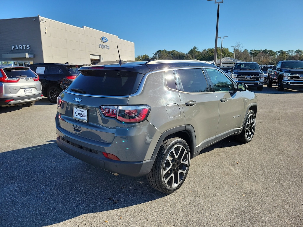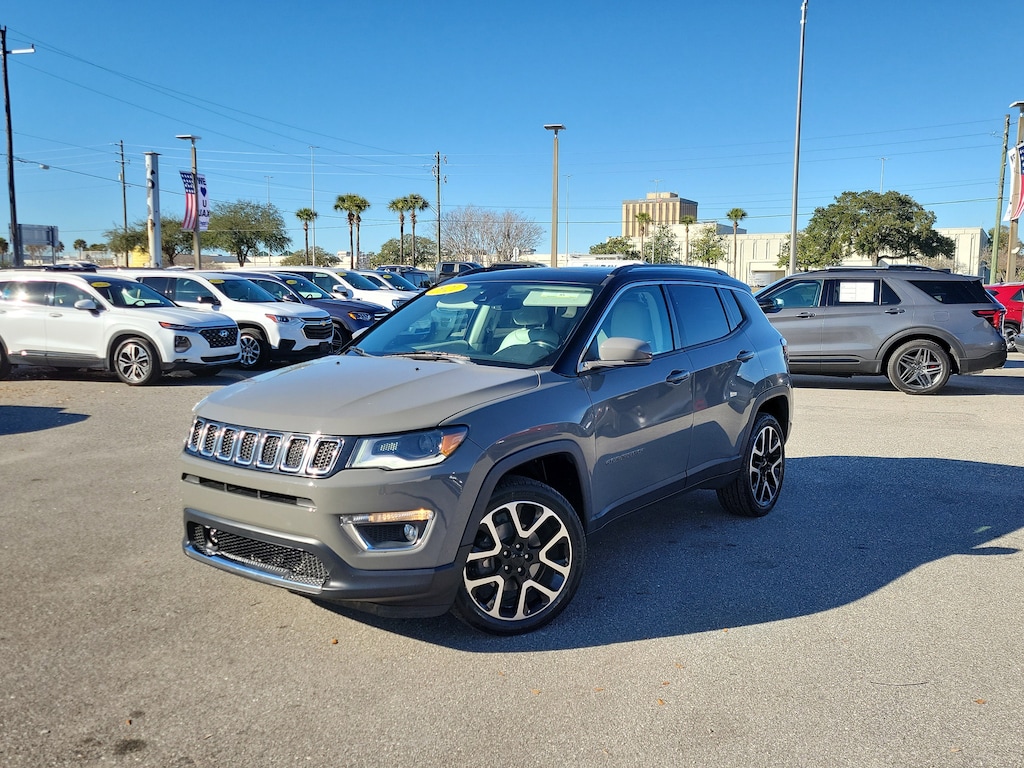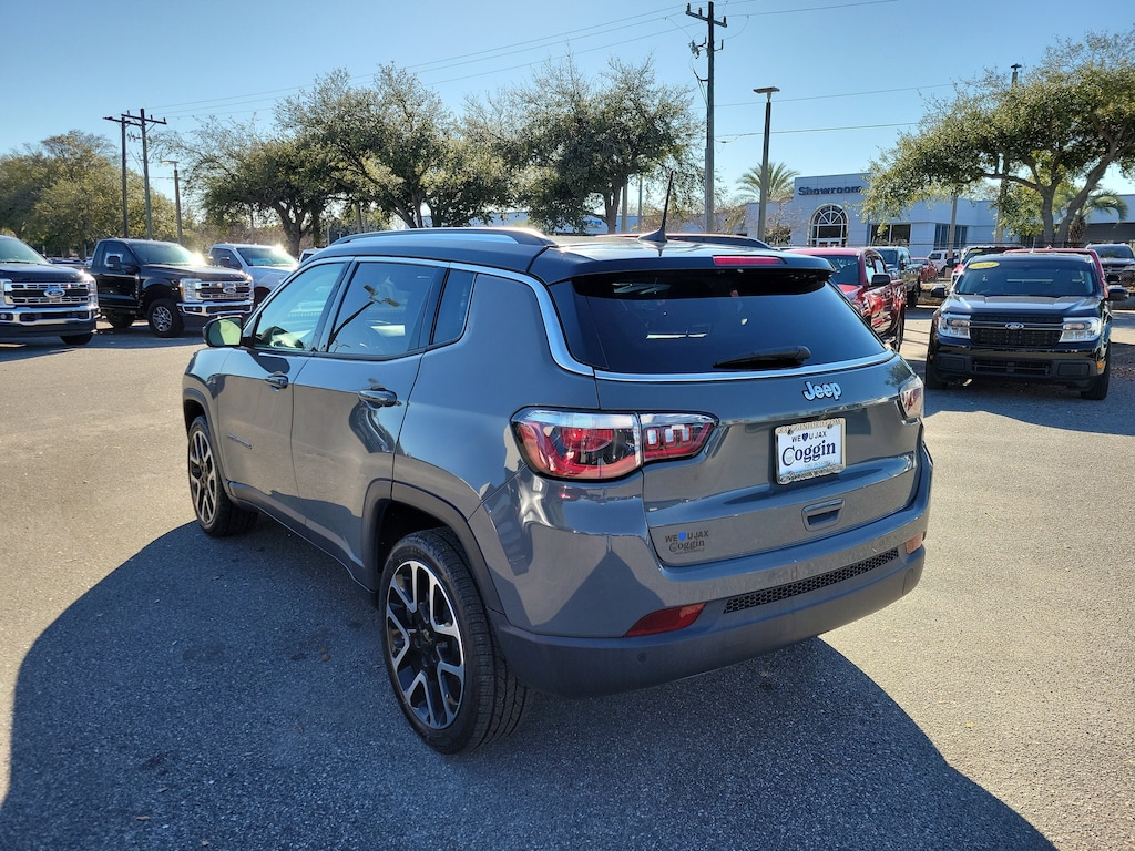 Priced below KBB Fair Purchase Price! This 2021 Jeep Compass Limited 4x4 is built for drivers who want everyday comfort with the confidence to handle changing road conditions, whether youre cruising through Jacksonville, heading west toward Tallahassee, or taking a weekend escape toward Orlando or the Gulf Coast. The Sting-Gray exterior pairs perfectly with a refined black and ski gray leather interior, giving this Compass a clean, upscale look that fits just as well in downtown Tampa as it does on back roads through southern Georgia. The 4x4 system with Selec-Terrain provides added confidence in rain, sand, or uneven terrain, while the smooth 9-speed automatic transmission and efficient 2.4L engine make daily driving easy and comfortable. Inside, youll find premium leather-trimmed seating with both heated and ventilated front seats, dual-zone automatic climate control, ambient interior lighting, and a panoramic dual-pane sunroof that fills the cabin with natural light. Technology is front and center with an 8.4-inch touchscreen featuring built-in navigation, Apple CarPlay, Android Auto, Bluetooth audio, HD Radio, and a premium Alpine sound system. Safety and driver-assist features include adaptive cruise control with stop and go, blind-spot monitoring, lane departure warning, forward collision warning with active braking, rear park assist, and a rearview camera, making long drives toward Daytona Beach or daily commutes around Starke and Kingsland more relaxing. Additional conveniences like remote start, a power liftgate, memory seating, keyless entry with push-button start, and a Class III trailer hitch add everyday versatility. If youre searching for a used Jeep Compass Limited 4x4 for sale in Jacksonville or North Florida, this well-equipped SUV stands out with its combination of luxury features, advanced safety technology, strong fuel economy, and all-weather capability, making it an excellent option for drivers throughout Northeast Florida, southern Georgia, and beyond., 4WD, 1-Year SiriusXM Guardian Trial, 4G LTE Wi-Fi Hot Spot, 5-Year SiriusXM Traffic Service, 5-Year SiriusXM Travel Link Service, 7 & 4 Pin Wiring Harness, Bi-Xenon HID Headlamps w/LED Signature, Class III Receiver Hitch, Driver Seat Memory, Elite Exterior Group, Elite Interior Group, For Details, Visit DriveUconnect.com, GPS Navigation, HD Radio, LED Taillamps, Power 8-Way Driver & Passenger Seats, Power Front/Fixed Rear Full Sunroof, Power Liftgate, Premium Alpine Speaker System, Premium Leather Trimmed Bucket Seats, Quick Order Package 2GG, Radio: Uconnect 4C Nav w/8.4 Display, Reversible Carpet/Vinyl Cargo Mat, SiriusXM Traffic Plus, SiriusXM Travel Link, Sun and Sound Group, Trailer Tow Group, Ventilated Front Seats, Wheels: 19 x 7.5 Diamond Cut Aluminum.