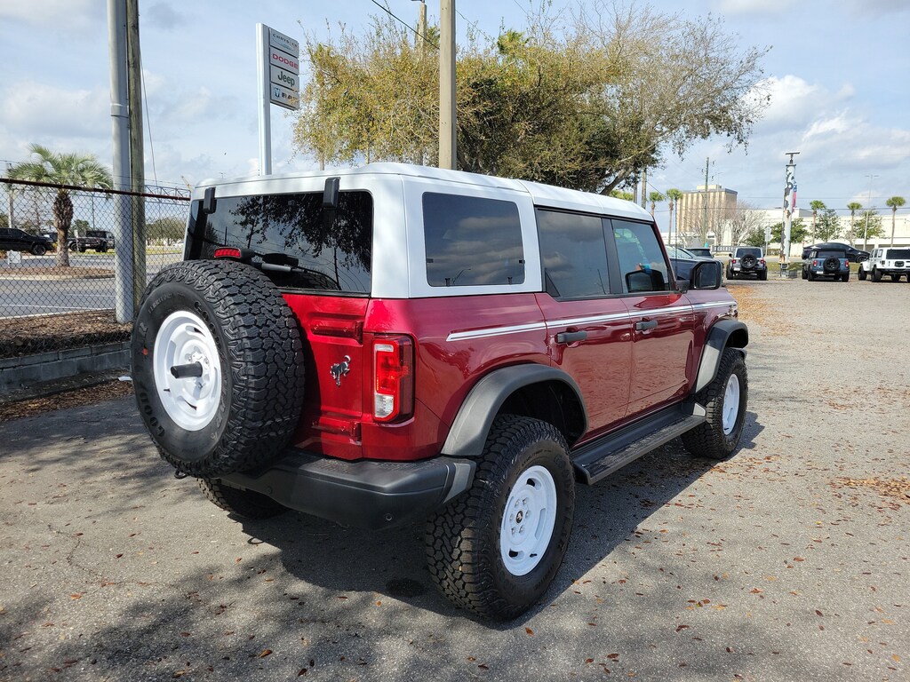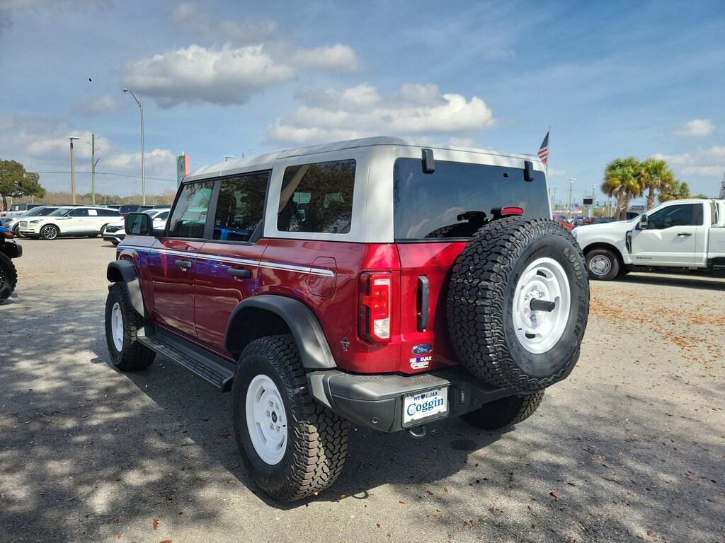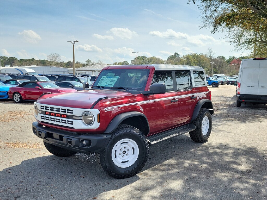 The **2025 Ford Bronco Heritage 4-Door 4x4** delivers classic Bronco character paired with modern off-road capability and everyday comfort, creating an SUV thats as fun to drive as it is capable. Finished in eye-catching **Ruby Red Metallic Tinted Clearcoat** and highlighted by distinctive Heritage styling cues, this Bronco stands out with a bold retro look backed by serious performance. Power comes from a robust **2.7L EcoBoost V6 engine** paired with a **10-speed automatic transmission**, delivering strong torque, smooth acceleration, and confident performance on pavement and off the beaten path. Equipped with **Advanced 4x4**, **G.O.A.T. Modes (Goes Over Any Type of Terrain)**, and the **Sasquatch Package with 35-inch tires**, this Bronco is built to tackle sand, trails, and rugged terrain with ease while still remaining comfortable for daily driving. Inside, the Heritage cabin blends vintage-inspired design with modern functionality, featuring **Navy and Onyx plaid cloth seating**, a **digital instrument cluster**, and a large **12-inch center touchscreen** powered by **SYNC 4**. **Dual-zone automatic climate control**, **smart USB charging ports**, and intuitive controls keep the interior comfortable and connected, whether youre running errands or heading out on an adventure. Thoughtful touches like the **leather-wrapped steering wheel**, **carpeted flooring**, and spacious rear seating add to its everyday usability. Built for open-air freedom, this Bronco includes a **white-painted hard top**, **sound-deadening headliner**, and a **tool kit for easy door and roof removal**, letting you quickly transform your drive when the weather is right. Safety and driver-assist features such as **pre-collision assist with automatic emergency braking**, **hill start assist**, **AdvanceTrac with Roll Stability Control**, and a **rear view camera** provide added confidence both on-road and off. Available in **Jacksonville, FL**, and proudly serving **Duval County, Clay County, St. Johns County, Ponte Vedra, Ponte Vedra Beach, Daytona, Daytona Beach, Orange Park, St. Augustine, Fernandina Beach, and South Georgia communities**.
