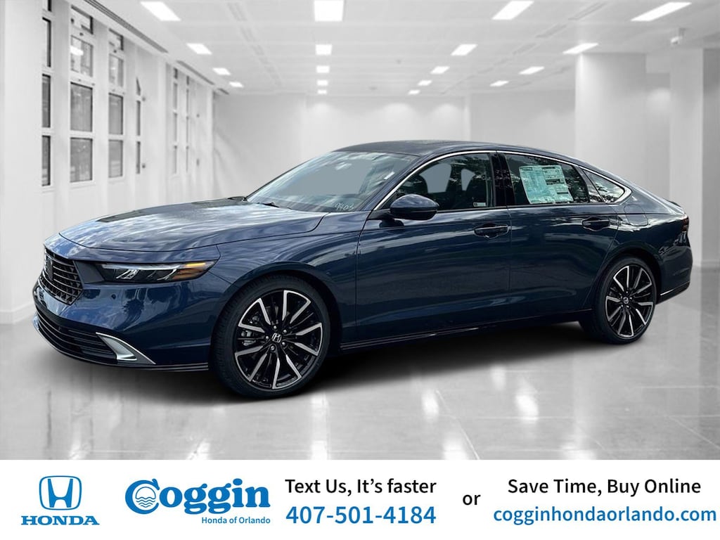 Canyon River Blue Metallic 2025 Honda Accord Hybrid 4D Sedan Touring eCVT 2.0L I4 DOHC 16V 46/41 City/Highway MPG 2.0L I4 DOHC 16V.