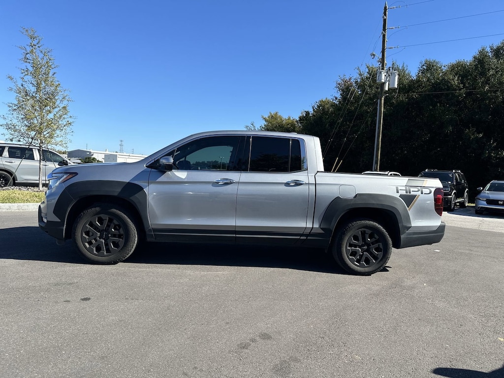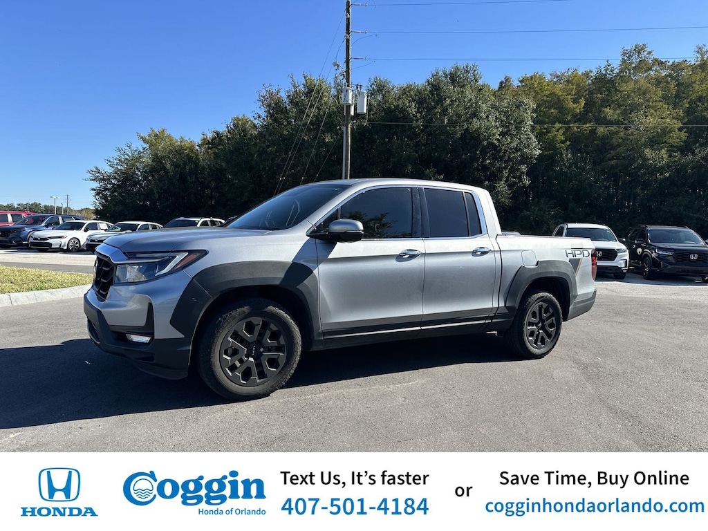 Priced below KBB Fair Purchase Price! Honda Certified! 7 year 100,000 Mile Factory Warranty! HONDA CERTIFIED, ONE OWNER, CLEAN CARFAX, APPLE CARPLAY, ANDROID AUTO, BLUETOOTH, HANDSFREE, BACKUP CAMERA, LEATHER, POWER WINDOWS, POWER LOCKS, ALLOY WHEELS, SUPER LOW MILES, LOCAL TRADE, BOUGHT AND SERVICED AT COGGIN HONDA OF ORLANDO, EXCELLENT SERVICE HISTORY, COME SEE THIS TODAY!, PRICE INCLUDES ALL RECONDITIONING FEES, Ridgeline RTL-E, 4D Crew Cab, 3.5L V6 SOHC i-VTEC 24V, 9-Speed Automatic, AWD, Black Leather, 4-Wheel Disc Brakes, 8 Speakers, ABS brakes, Air Conditioning, All Season Floor Mats, AM/FM radio: SiriusXM, Apple CarPlay/Android Auto, Auto-dimming Rear-View mirror, Automatic temperature control, Blind Spot Information (BSI) System warning, Bluetooth® Hands-Free Link, Brake assist, Bumpers: body-color, Compass, Driver door bin, Driver vanity mirror, Driver's Seat Mounted Armrest, Dual front impact airbags, Dual front side impact airbags, Electronic Stability Control, Four wheel independent suspension, Front anti-roll bar, Front dual zone A/C, Front reading lights, Garage door transmitter: HomeLink, Heated door mirrors, Heated Front Bucket Seats, Heated front seats, Heated steering wheel, Honda Satellite-Linked Navigation System, Illuminated entry, Leather Seat Trim, Low tire pressure warning, Memory seat, Navigation system: Honda Satellite-Linked Navigation System, Occupant sensing airbag, Outside temperature display, Overhead airbag, Overhead console, Passenger seat mounted armrest, Passenger vanity mirror, Power door mirrors, Power driver seat, Power moonroof, Power passenger seat, Power steering, Power windows, Radio data system, Radio: 540-Watt Premium Audio System w/8 Speakers, Rear air conditioning, Rear anti-roll bar, Rear reading lights, Rear seat center armrest, Rear step bumper, Rear window defroster, Remote keyless entry, Speed-sensing steering, Split folding rear seat, Steering wheel mounted audio controls, Tachometer, Telescoping steering wheel, Tilt steering wheel, Traction control, Trip computer, Turn signal indicator mirrors. KBB Fair Market Range High: $34,411 CARFAX One-Owner. Clean CARFAX. Certified. 2023 Honda Ridgeline RTL-E Lunar Silver Metallic 2023 Honda Ridgeline RTL-E 4D Crew Cab AWD 9-Speed Automatic 3.5L V6 SOHC i-VTEC 24V