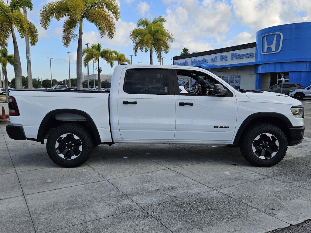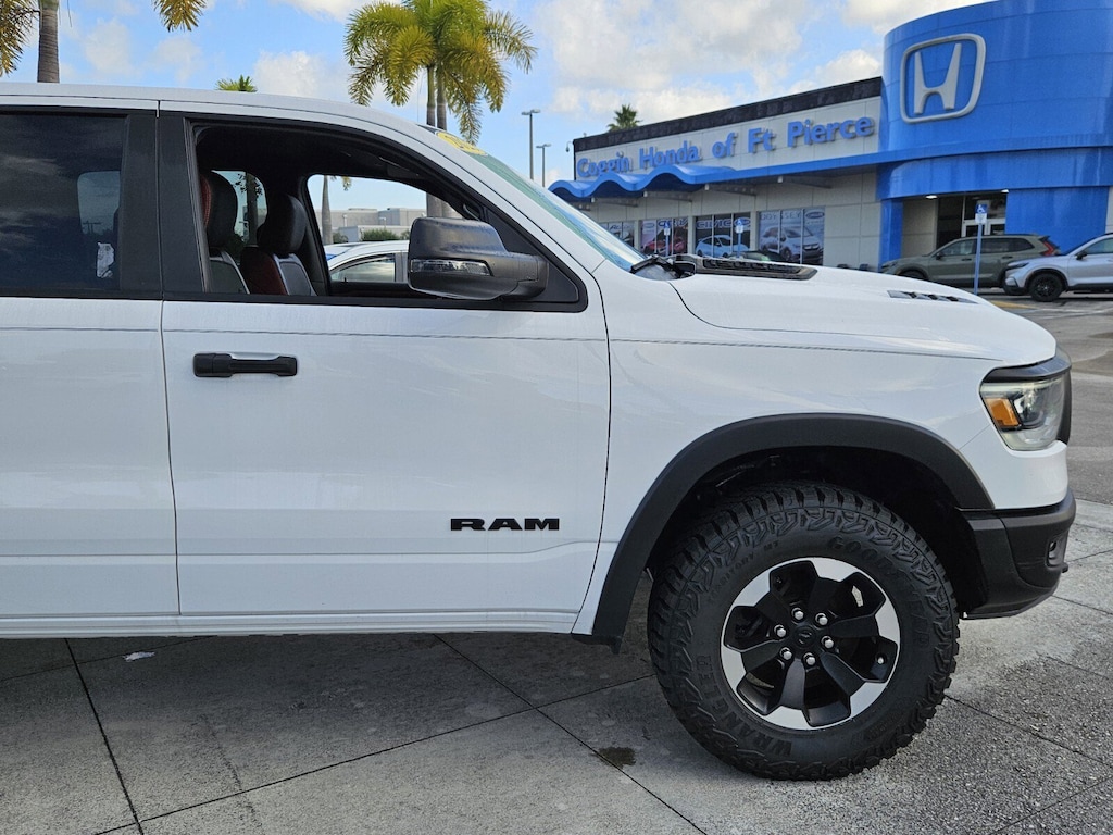 2023 Ram 1500 Rebel 4x4 This 2023 Ram 1500 Rebel delivers aggressive styling strong V8 performance and the off-road capability Ram is known for. With only 29094 miles a striking Bright White Clearcoat exterior and a bold Red/Black interior this Rebel stands out on the road and on the lot. Key Features: **HEMI 5.7L V8 with eTorque for increased torque smoother power delivery and improved efficiency** **4x4 Off-Road Capability with Rebel-tuned suspension and factory skid plates** **8-Speed Automatic Transmission for responsive acceleration** **Crew Cab with full-size rear seating and excellent interior space** **Rebel Appearance Package with blacked-out accents and aggressive styling cues** **Uconnect Infotainment with touchscreen interface** **Apple CarPlay and Android Auto** **Premium Cloth/Vinyl Red & Black Interior** **LED Lighting for improved visibility** **All-Terrain Tires and Rebel Alloy Wheels** **Tow Package with integrated trailer brake controller** **Keyless Entry and Push-Button Start** **Sport Performance Hood** Why This Rebel? You get the power of a HEMI the ruggedness of a true off-road setup and the refinement Ram trucks are known for. Its the perfect combination of daily comfort and weekend capability. Take It for a Spin If you're looking for a truck that turns heads handles real work and delivers a premium feel this Rebel needs to be on your short list. Stop by Coggin Honda of Ft. Pierce for a test drive today or let me arrange a time that works best for you. 12 Touchscreen Display 2nd Row In Floor Storage Bins 4G LTE Wi-Fi Hot Spot 9 Amplified Speakers w/Subwoofer Apple CarPlay Auto-Dimming Exterior Driver Mirror Black Exterior Mirrors Black Premium Power Mirrors Connected Travel & Traffic Services Connectivity - US/Canada Convex Wide-Angle Exterior Mirror Insert Disassociated Touchscreen Display Exterior Mirrors Courtesy Lamps Exterior Mirrors w/Heating Element Exterior Mirrors w/Supplemental Signals Foam Bottle Insert (Door Trim Panel) For Details Visit DriveUconnect.com For More Info Call 800-643-2112 Global Telematics Box Module (TBM) Google Android Auto GPS Antenna Input GPS Navigation HD Radio Heated Front Seats Heated Steering Wheel Integrated Center Stack Radio Integrated Voice Command w/Bluetooth Navigation System Off-Road Information Pages Power 2-Way Driver Lumbar Adjust Power 8-Way Driver Seat Power Adjustable Pedals Power-Folding Mirrors Quick Order Package 27W Rebel Radio: Uconnect 5 Nav w/12.0 Display Rear Dome w/On/Off Switch Lamp Rear Power Sliding Window Rear Window Defroster Rebel Level 1 Equipment Group SiriusXM Radio Service SiriusXM w/360L Sun Visors w/Illuminated Vanity Mirrors Universal Garage Door Opener USB Host Flip. CARFAX One-Owner. Clean CARFAX. 4X4 Odometer is 6471 miles below market average! Priced below KBB Fair Purchase Price!4WD 8-Speed Automatic HEMI 5.7L V8 Multi Displacement VVT eTorque